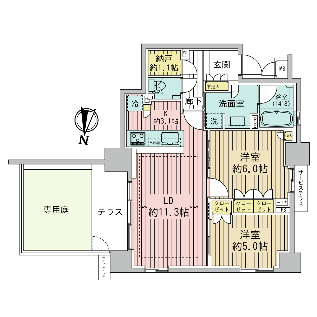 | 備考 | テラス 5.32m² 専用庭 約11m² サービステラス 1.80m² |